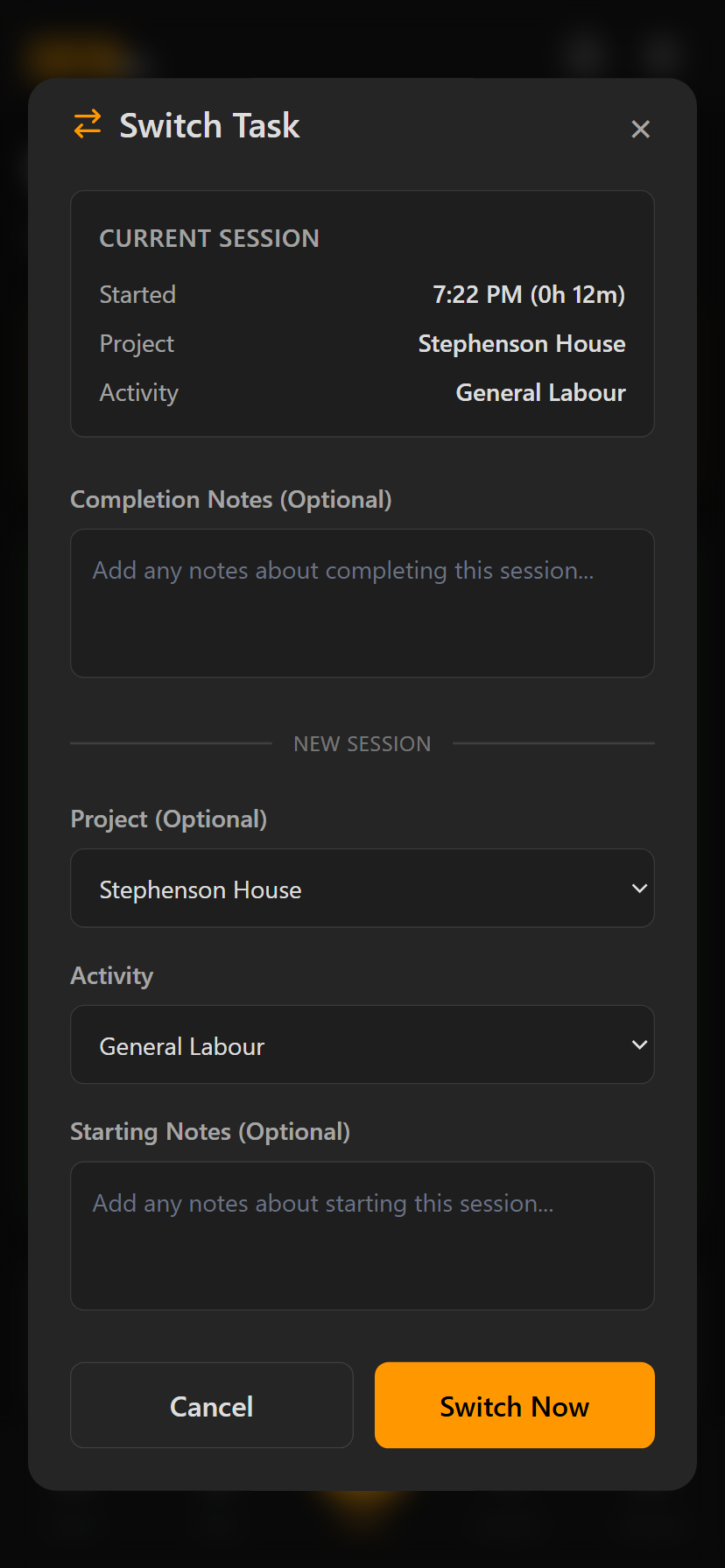 The Switch Task feature lets you transition from one task to another seamlessly. It clocks you out of your current task and immediately clocks you into a new one at the same timestamp - no gaps in your time tracking.